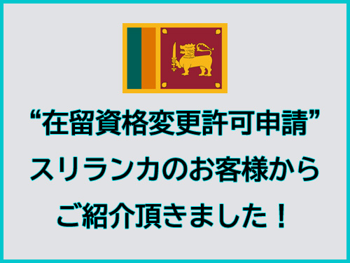先日、Webから受任したスリランカのお客様が、自分のことをお友達に紹介してくれまして、新たにビザ変更申請の依頼を頂きました!!